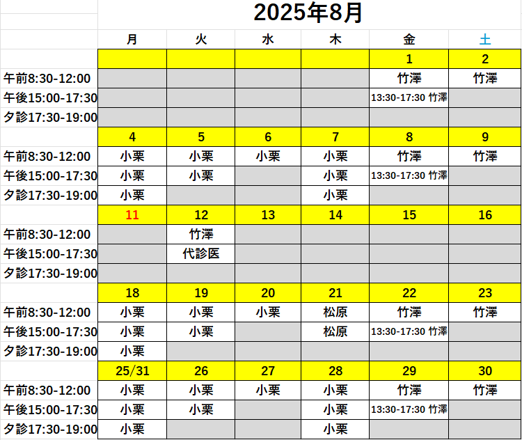 2025年8月外来担当表 2025.08.01 2025.10.13 診療情報 Post Share Hatena Pocket RSS feedly Pin it 記事のタイトルとURLをコピーする 2025年8月の外来担当表です。 記事のタイトルとURLをコピーする Post Share Hatena Pocket RSS feedly Pin it 2025年7月外来担当表 前の記事 2025年9月外来担当表 次の記事
